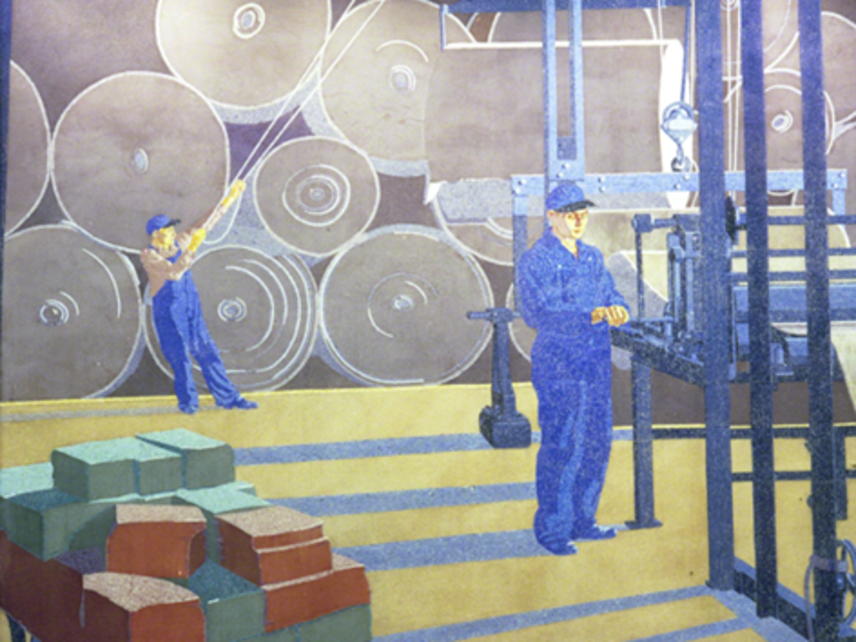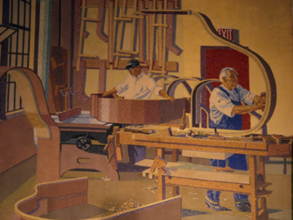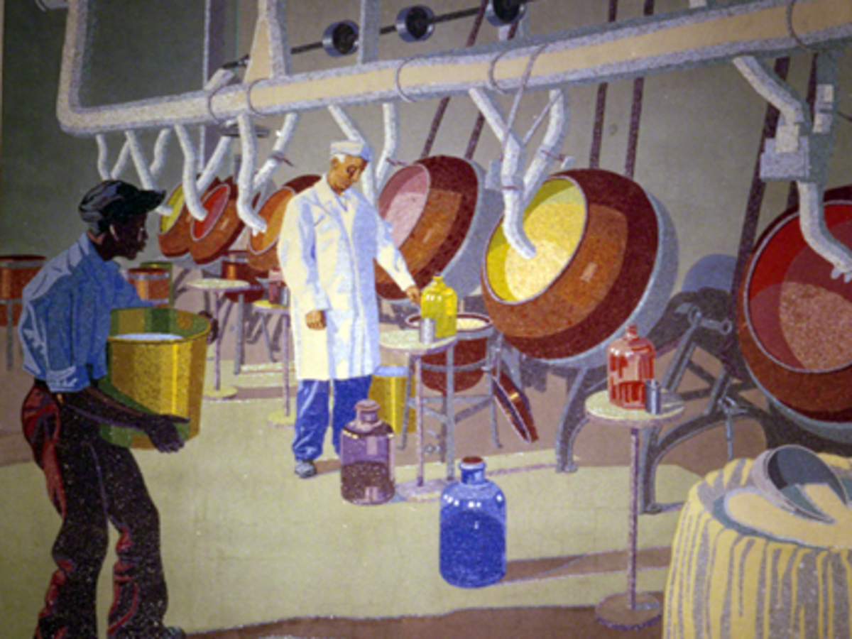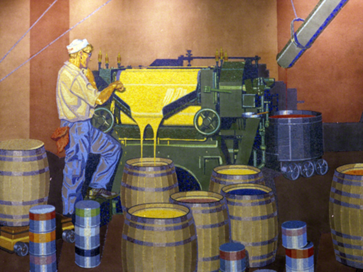 Originally commissioned as oil paintings, Reiss chose to create each mural as a mosaic to protect the art from the elements of a working train station. The murals portray 35 workers of industries within Cincinnati, Ohio and are meant celebrate labor, a common theme for art at the time.